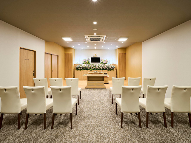 小さい家族葬ホールは、15名様までの家族や親しい友人だけでアットホームな雰囲気の中で落ち着いて他人の目を気にすることなく、故人を偲ぶ事が出来る空間となっております。